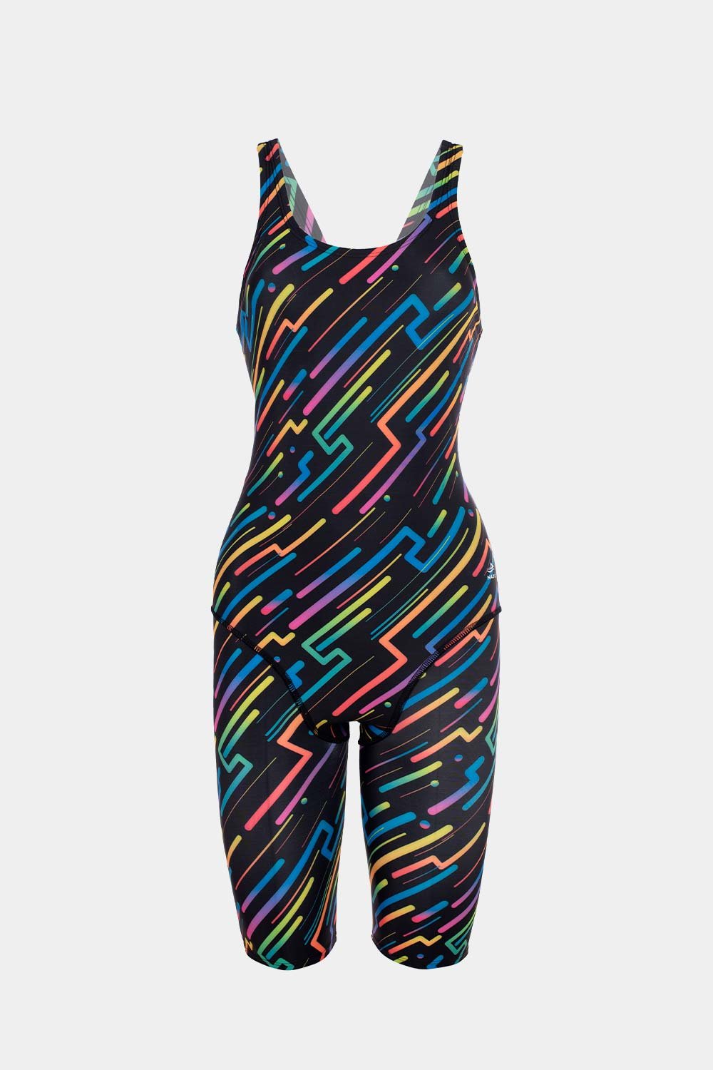 Su diseño ajustado, con largo hasta la rodilla, y espalda semiabierta con tirantes gruesos que proporcionan un ajuste firme, optimiza la hidrodinámica al reducir la resistencia al agua, permitiendo una patada más eficiente.